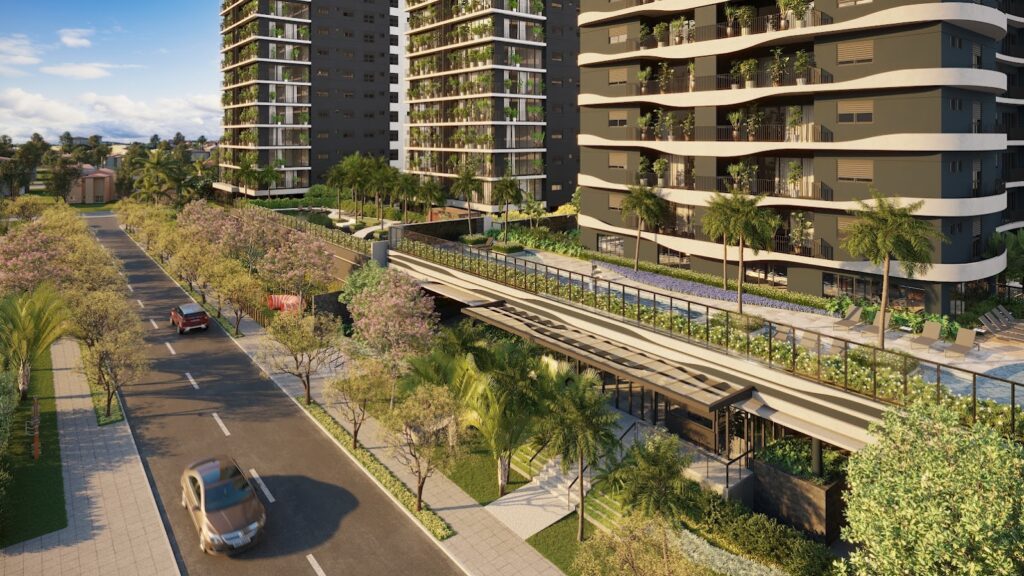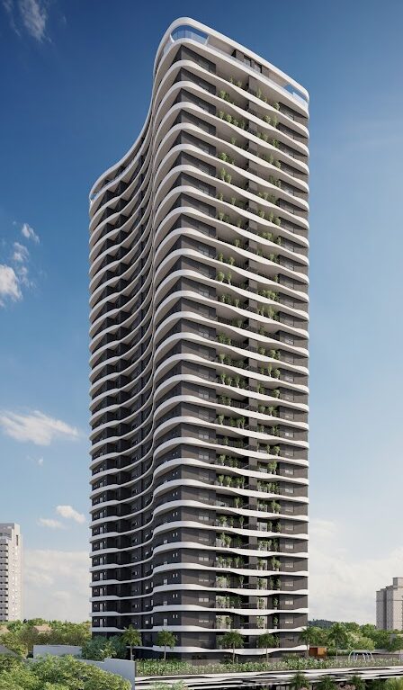 O novo lançamento conta com uma fachada com volume orgânico que se destaca na paisagem, seguindo a tendência do design biofílico.